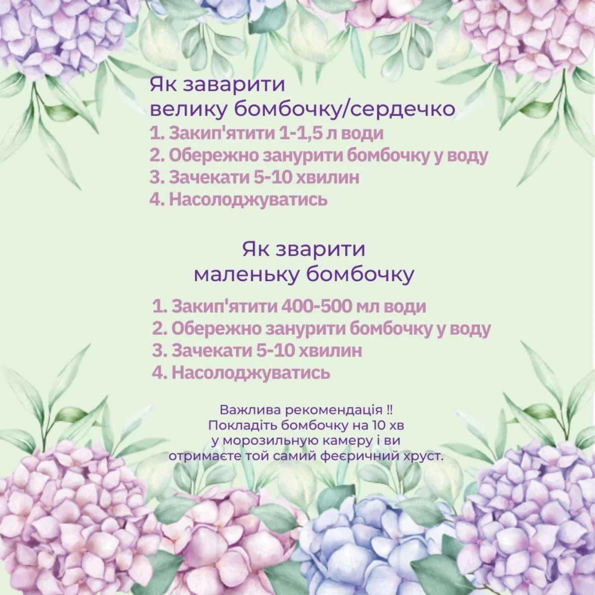 Перед заварювання чайної бомбочки, покладіть її у морозильну камеру на 10 хвилин. Зберігайте бомбочки у їх оригінальній упаковці подальше від сонячних променів та вологи. Не в холодильнику.