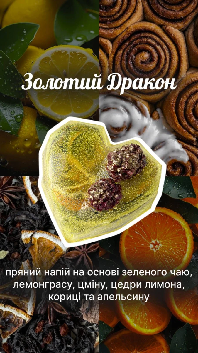 Чайна бомбочка "Золотий дракон" - це прянний напій на основі зеленого чаю, лимонграс, цміну, цедри лимона, кориці та апельсину. Прикрашене серце сублімованою ожиною.