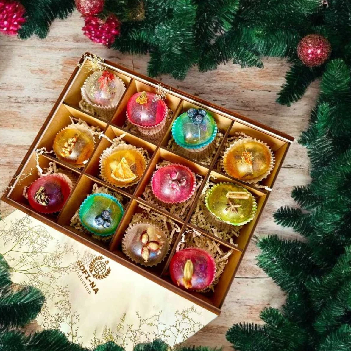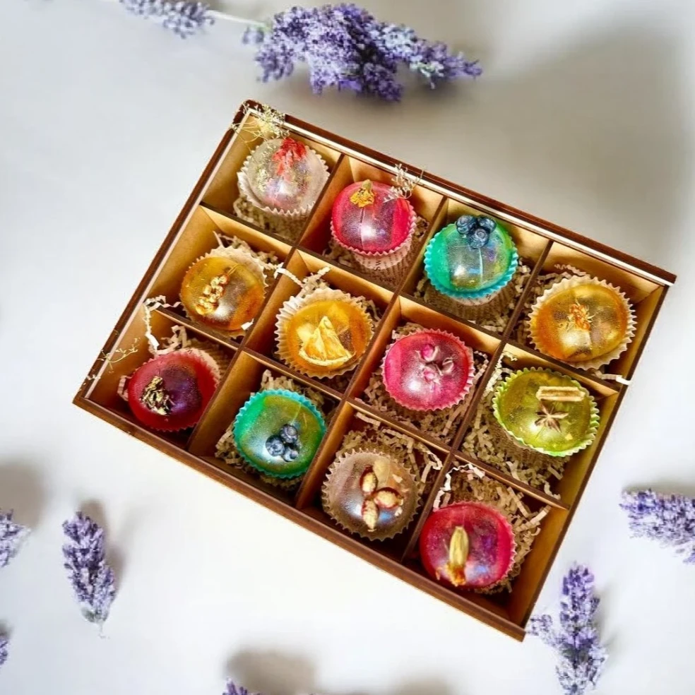 Подарунковий набір з 12-ю маленькими чайними бомбочками ручної роботи у дерев'яній подарунковій упаковці