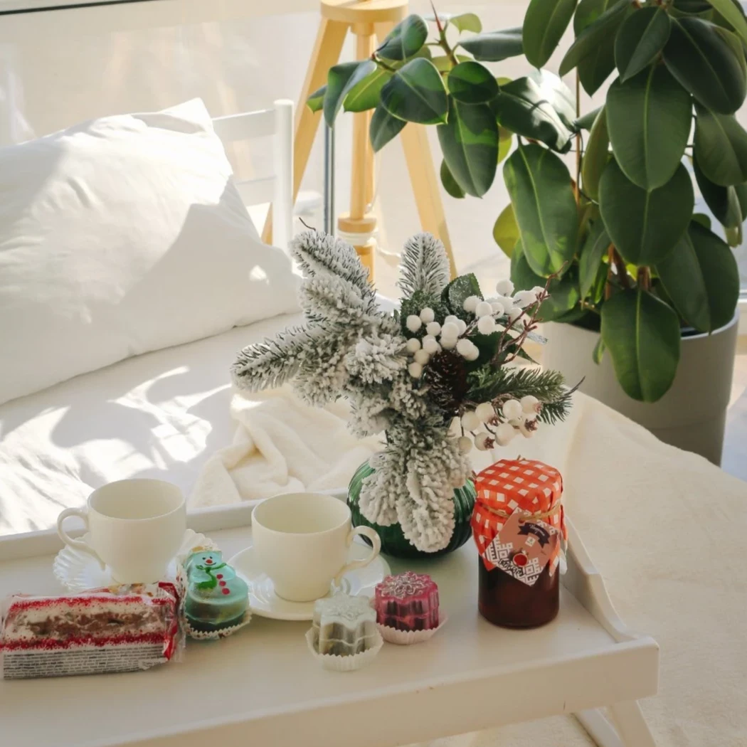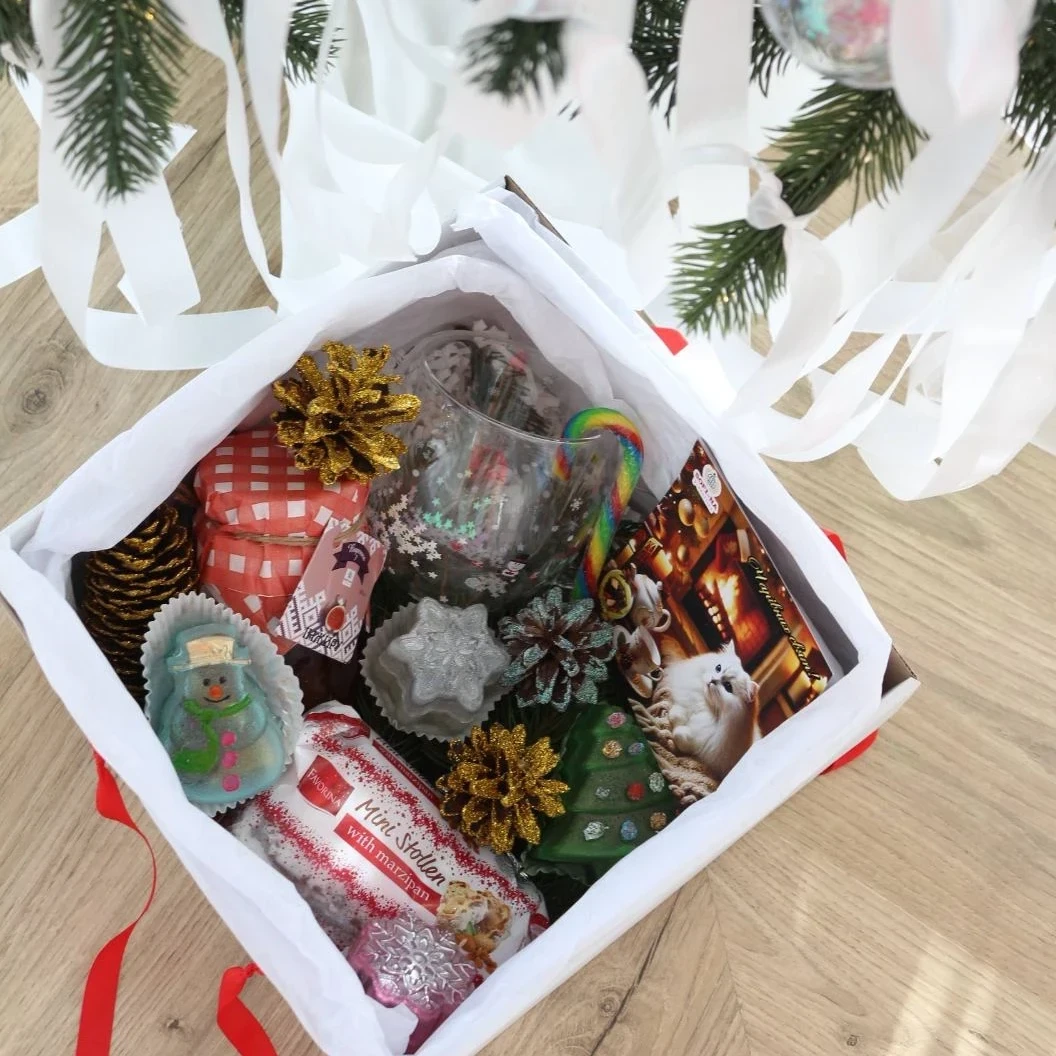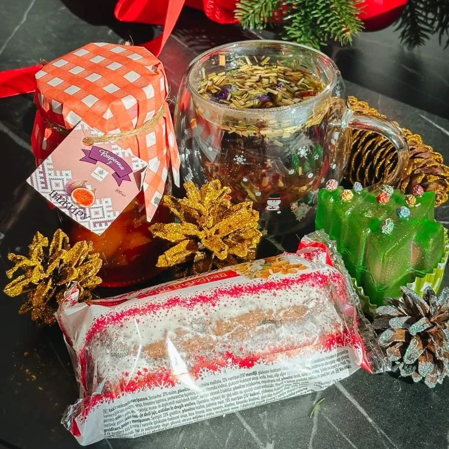 - Склад подарункового набору: новорічні чайні бомбочки: ялинка, сніговик. 2 сніжинки; новорічне горнятко; німецький кекс штолен; варення з цільних плодів інжиру; ялинкові іграшки з натуральної шишки сосни та смереки; листівка.